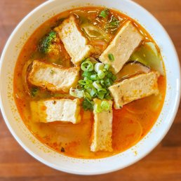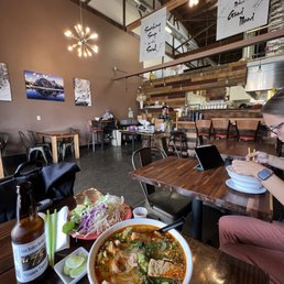 Went for the first time ever today but left expecting to come back again! Smaller space but did not feel pressured for takeout only, my partner & I were the only ones in on this hot day around 5pm and we enjoyed eating in. Had okay AC, we weren't uncomfortably warm. Warm wooden interior, 1/2 booths & chairs. I was seated facing three pleasant nature art pieces hung up. About 6 tables across the entire place plus some ecyrahigh chair bar seating. Amazing customer service from both people who helped us, friendly and quick. We sat and were given menus immediately, told to take our time then order at the counter. I mistakenly ordered the wrong item but remedied it quickly with the same server and he didn't seem annoyed or charge me for the mistake, about $1.65 difference. The service the entire time from walk-in to walk-out was nothing but pleasant and attentive. We got left alone for the most part as we prefer but we were never left lacking or waiting. shoutout to the cashier in glasses & server w/ the hat. I got offered chili oil and to-go boxes before I could ask. The food came out fairly quickly, "cowabunga pho" (w/ all beef meat) first, and then the combination vermicelli bowl with ground tork (their very tasty tofu "pork"). Both were great! Hot, flavorful, everything that was supposed to be crunchy was, and I loved their ground tork the texture and taste were amazing, tofu can sometimes be bland in meat alternatives but I loved this. The Pho broth was smooth and flavorful, and the veggies on side were fresh & crisp, plenty of it as well. Smaller place but doesn't skimp out at all on the food or full eating in experience. There's a bottle of sriracha & hoisin, along with your choice of utensils (chopsticks, forks, soup spoons, & long spoons), at each table so everything you need is right there. I loved that this place had vegan options for the same price and were just as flavorful & satiating! We got a raspberry vegan bubble tea to go, creamy & strong flavor. what I wanted for a hot day nothing to complain about.